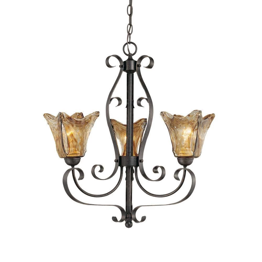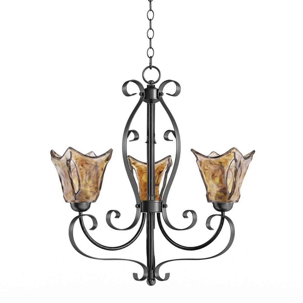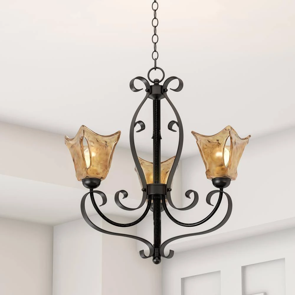 Add transitional illumination to your space with this 3-light chandelier. The umber swirl glass and burnished gold finish make it perfect for contemporary and retro interiors. Eye-catching and distinctive, this fixture adds visual interest to a hallway, kitchen island or dining room. It uses three, medium base 100-watt bulbs (sold separately) and includes all the hardware for an easy installation.