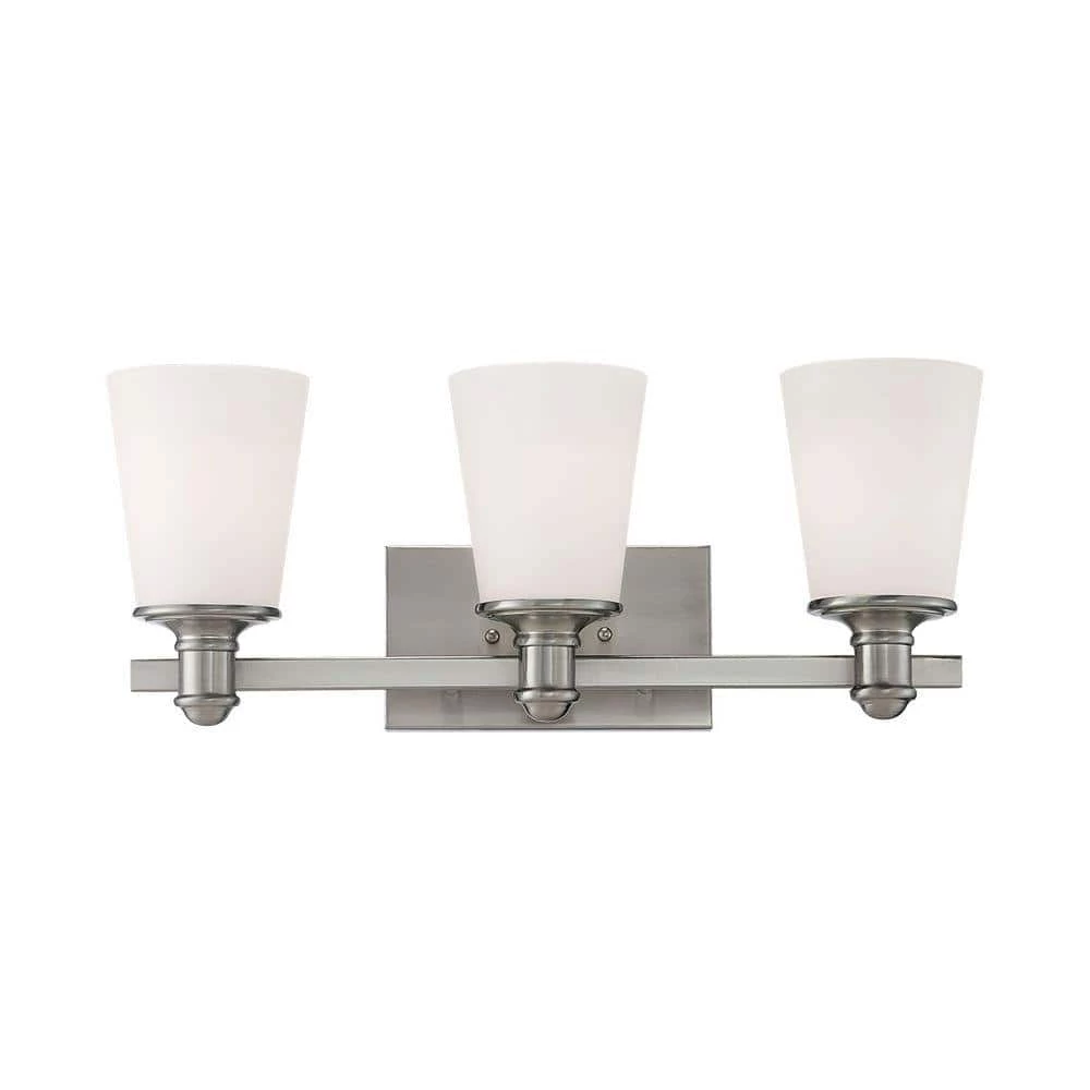 The Cimmaron Collection made from premium-quality material with a satin nickel finish. The cylinder type etched white glass shades to enhance the design of the fixture. Will complement a variety of home styles and decor.