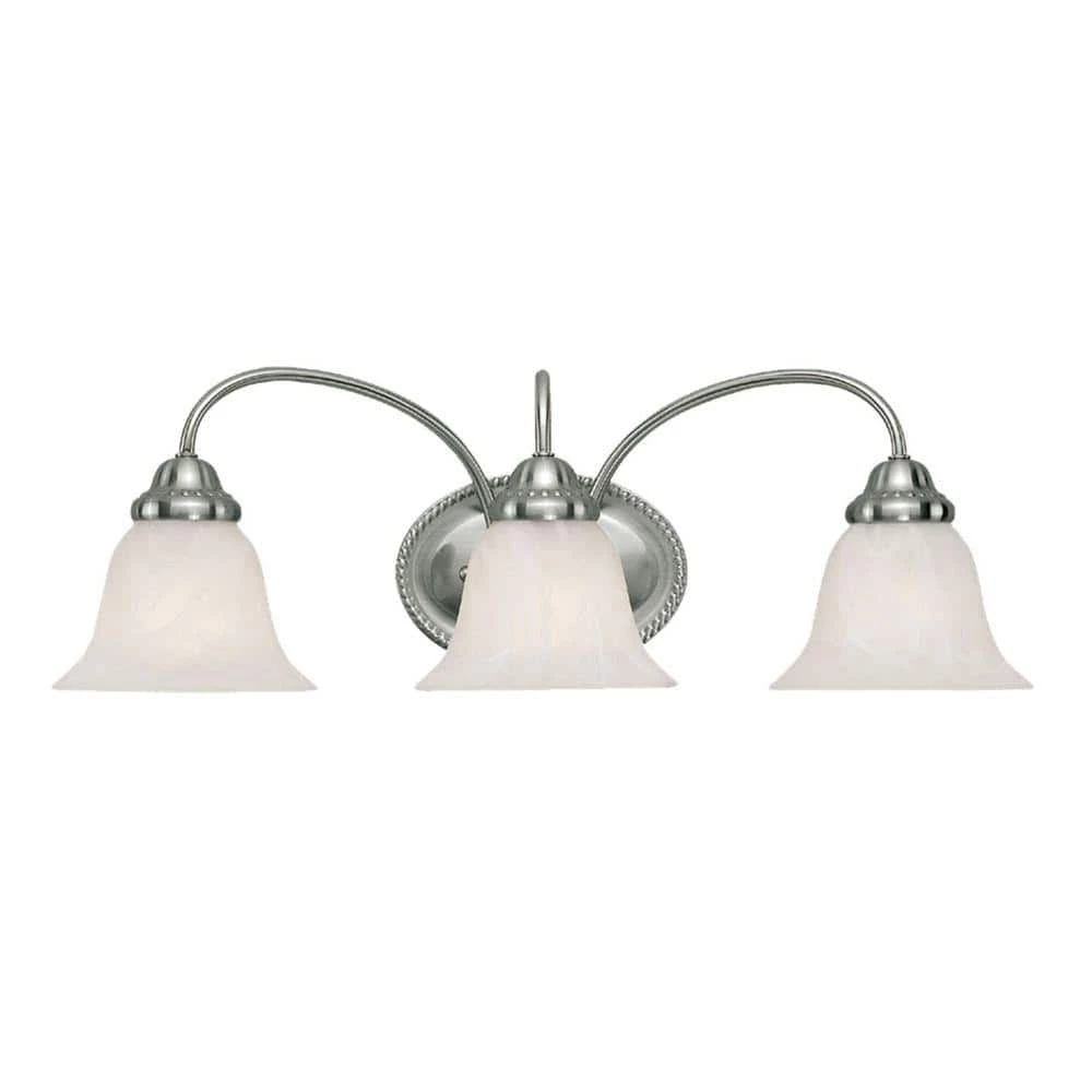 A vanity collection that offers a beautiful satin nickel finish with roping details on the base of mount. Stylish curvy arms that are complimented by bell shaped alabaster glass shades which illuminate pure lighting.