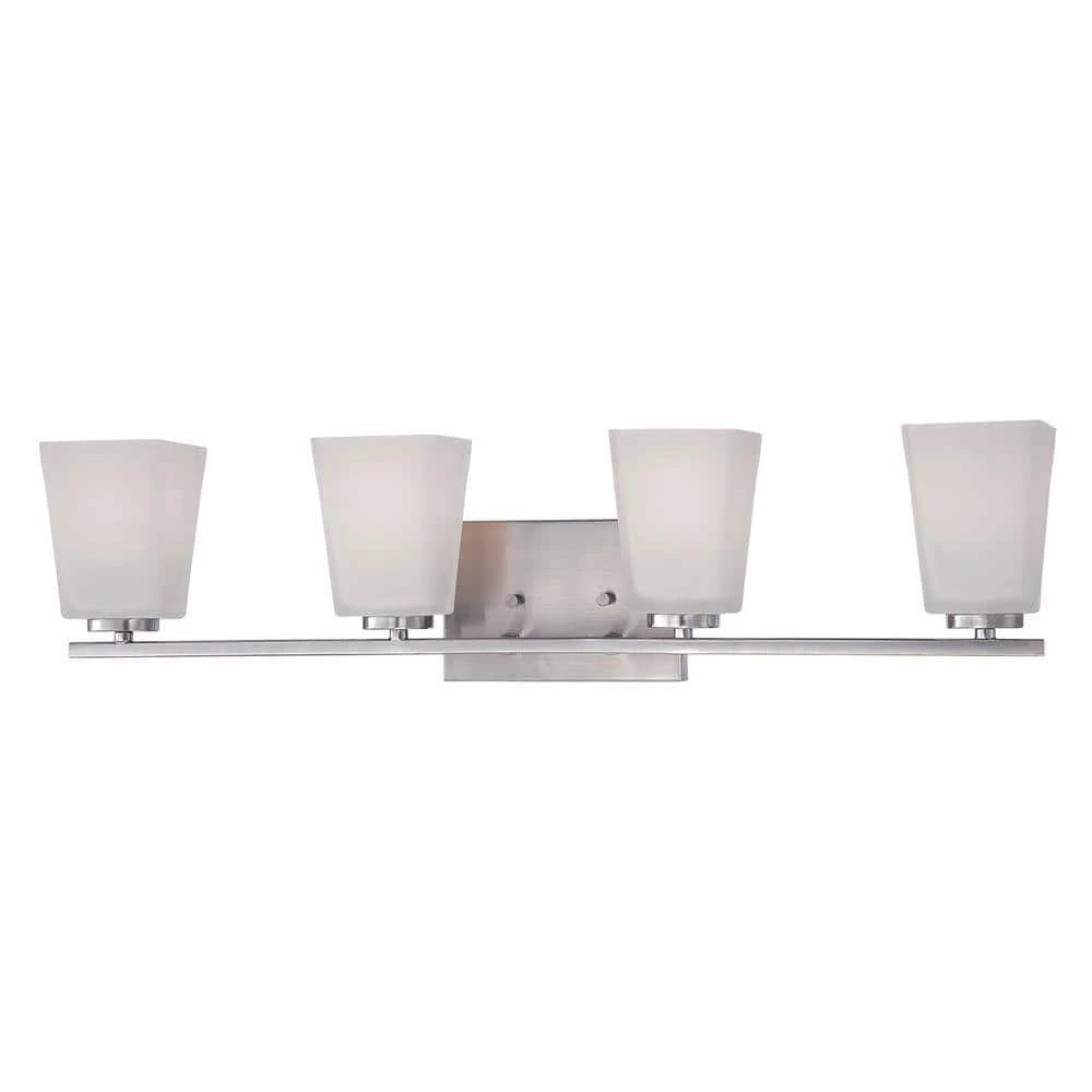 A vanity collection with brushed nickel finish surely creating an earthly, calm environment. A bar coming off of the square base of mount which lighting attaches. The etched white glass shades, keeping with the clean, straight line design, are also a square shape.