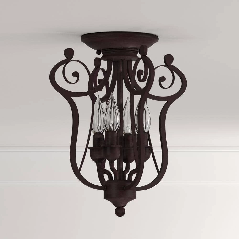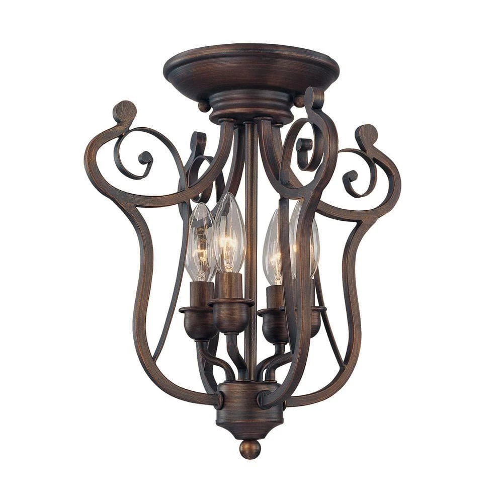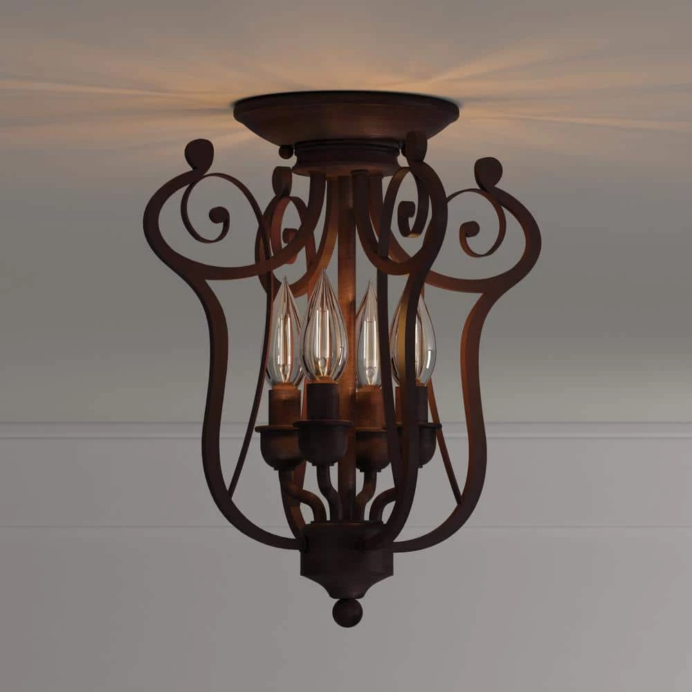 4-light semi flush mount. The Chateau Collection of complete class and grace displaying with fashionable swirl design in metal with a finish in rubbed bronze. The 60-Watt candle lights will capture and reflect a warm light.