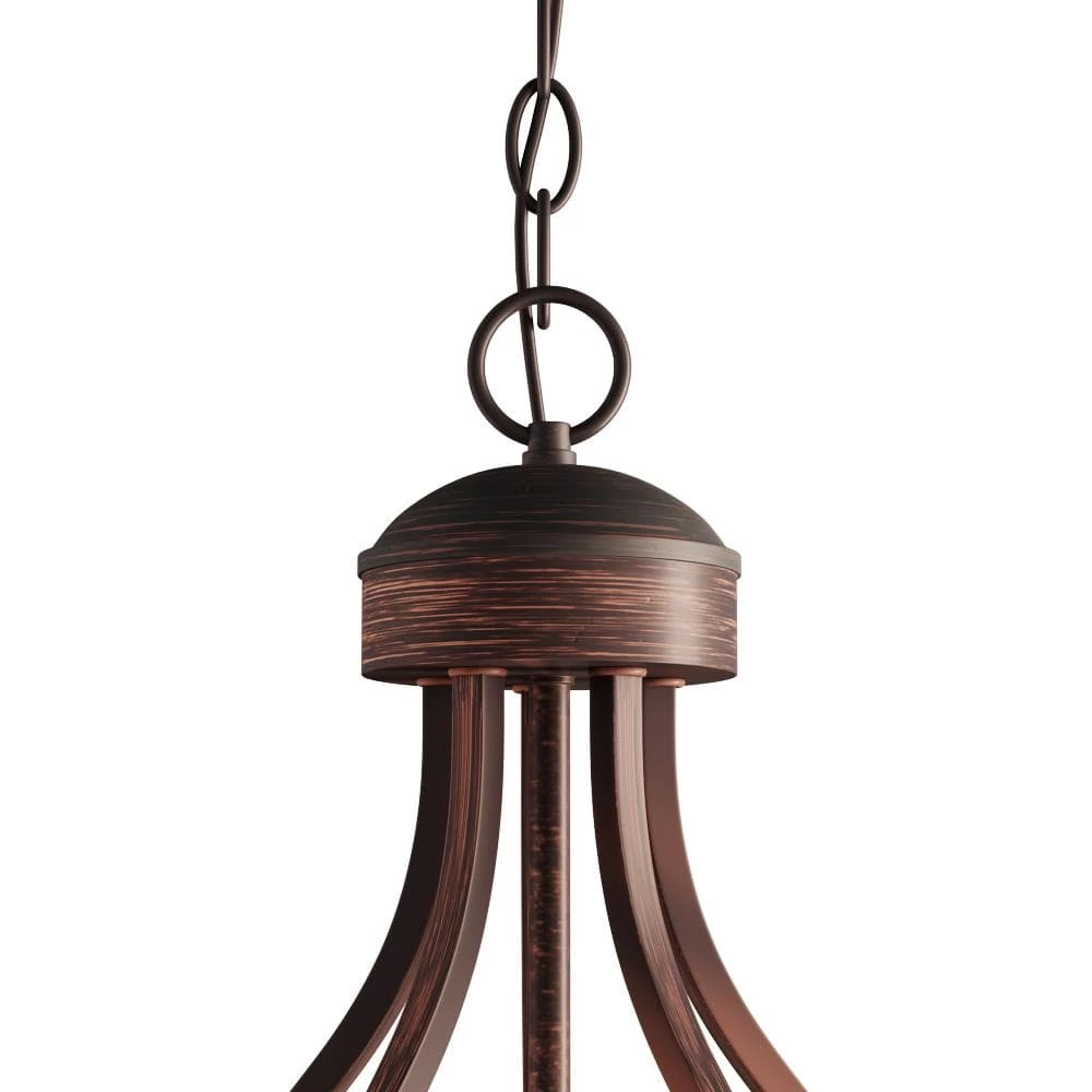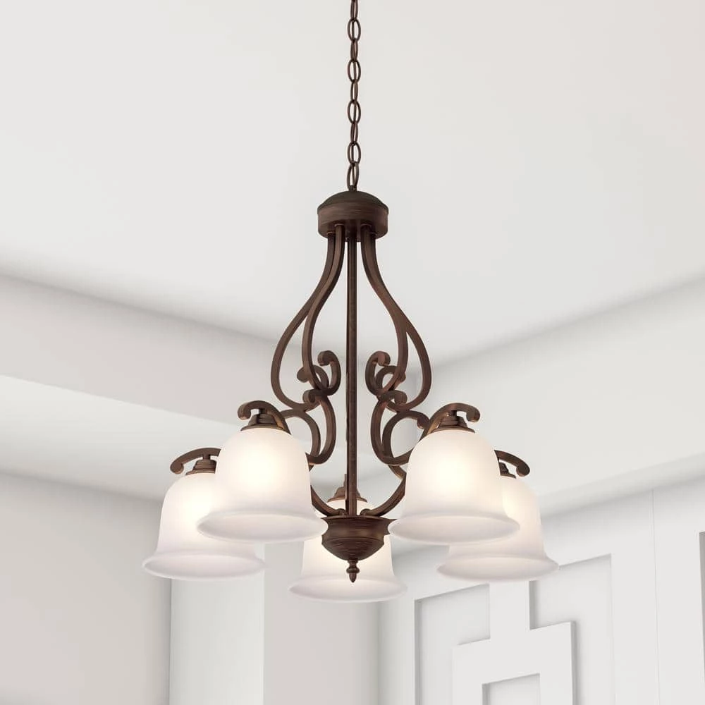 Add transitional illumination to your space with this 5-light chandelier from the Courtney Lakes collection. The Turinian Scavo glass shades and rubbed bronze finish make it perfect for contemporary and classic interiors. Eye-catching and distinctive, this chandelier adds visual interest to a dining room, foyer or living room. It uses five medium-base, 100-watt bulbs (sold separately) and includes all the hardware for an easy installation.