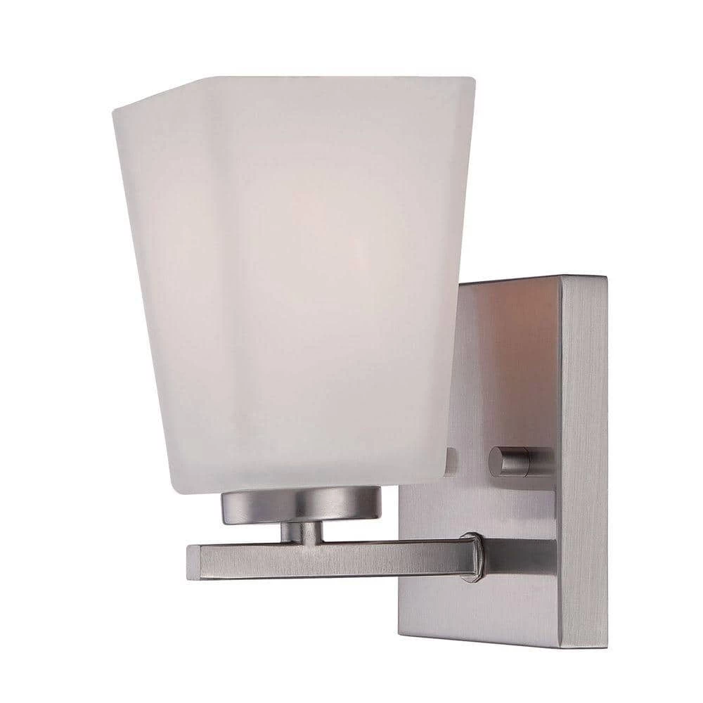 A vanity collection with brushed satin finish surely to create an earthly, calm environment. A bar coming off of the square base of mount which lighting attaches. The etched white glass shades, keeping with the clean, straight line design, are also a square shape.