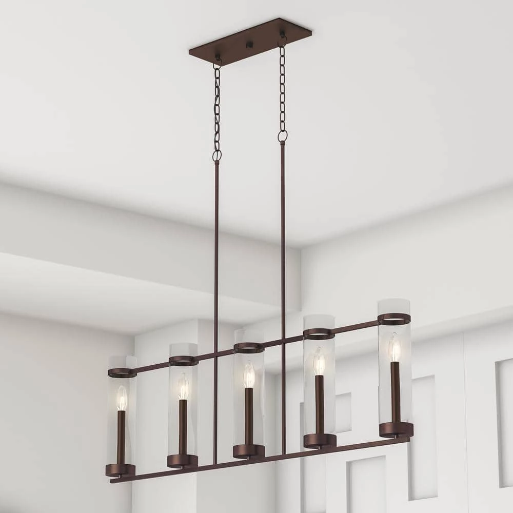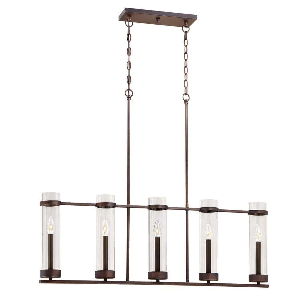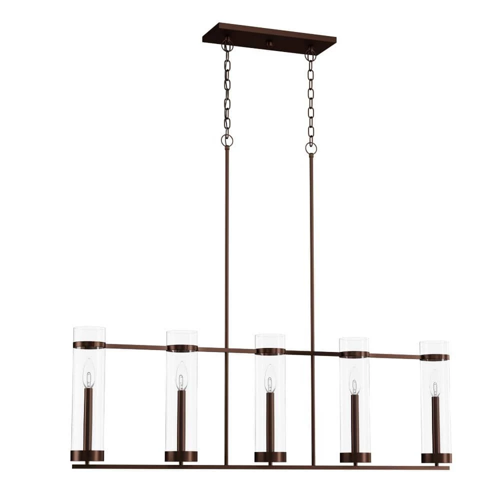 Sleek and elegant, this 5-Light Rubbed Bronze Fixture from the Milan Collection works beautifully with industrial or rustic decor. The adjustable hanging length ensures that your fixture fits perfectly wherever you want to install it. The clear glass lights and metallic finish are ideal for hallways, kitchens and dining rooms.