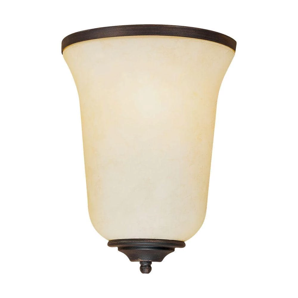 Rubbed bronze finish on this wall sconce is stylish with a timeless design. A turinian scavo glass shade offers a relaxing yet inviting illumination of light.